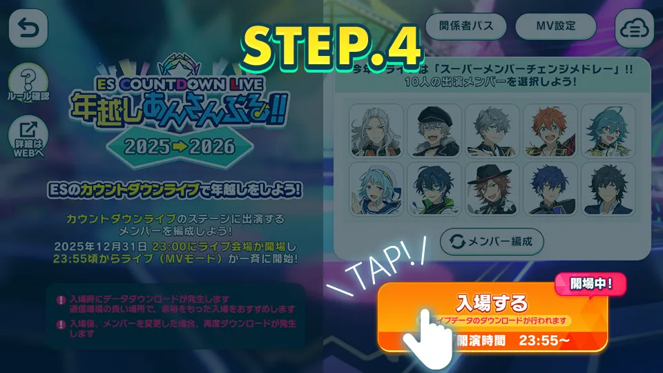 12月31日 23:00以降は入場するボタンが表示されますので、入場ボタンを押して入場しましょう。