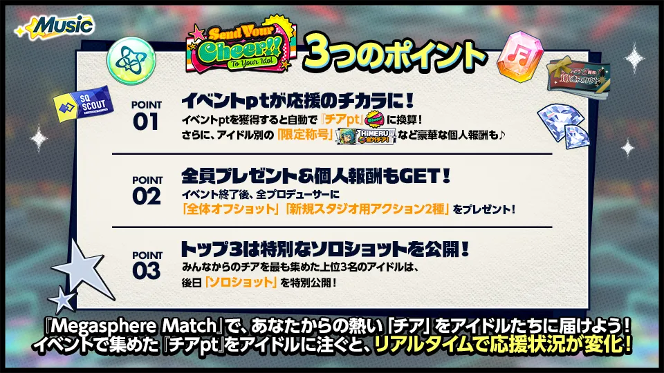 - イベントptを獲得すると自動で『チアpt』に換算!参加アイドルの中から応援したい子を自由に選んで、どんどんチアを贈ろう!