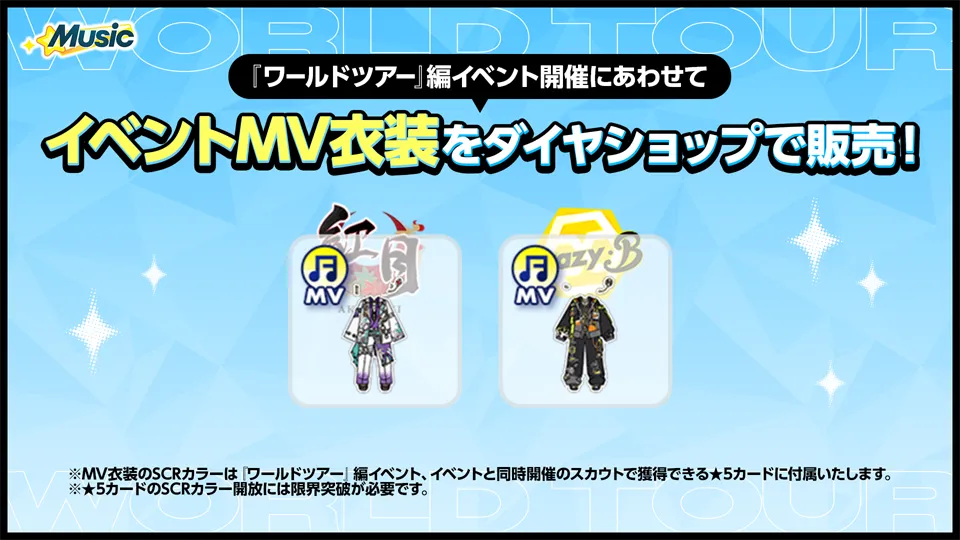 - MV衣装のSCRカラーは『ワールドツアー』編イベント、イベントと同時開催のスカウトで獲得できる★5カードに付属いたします。